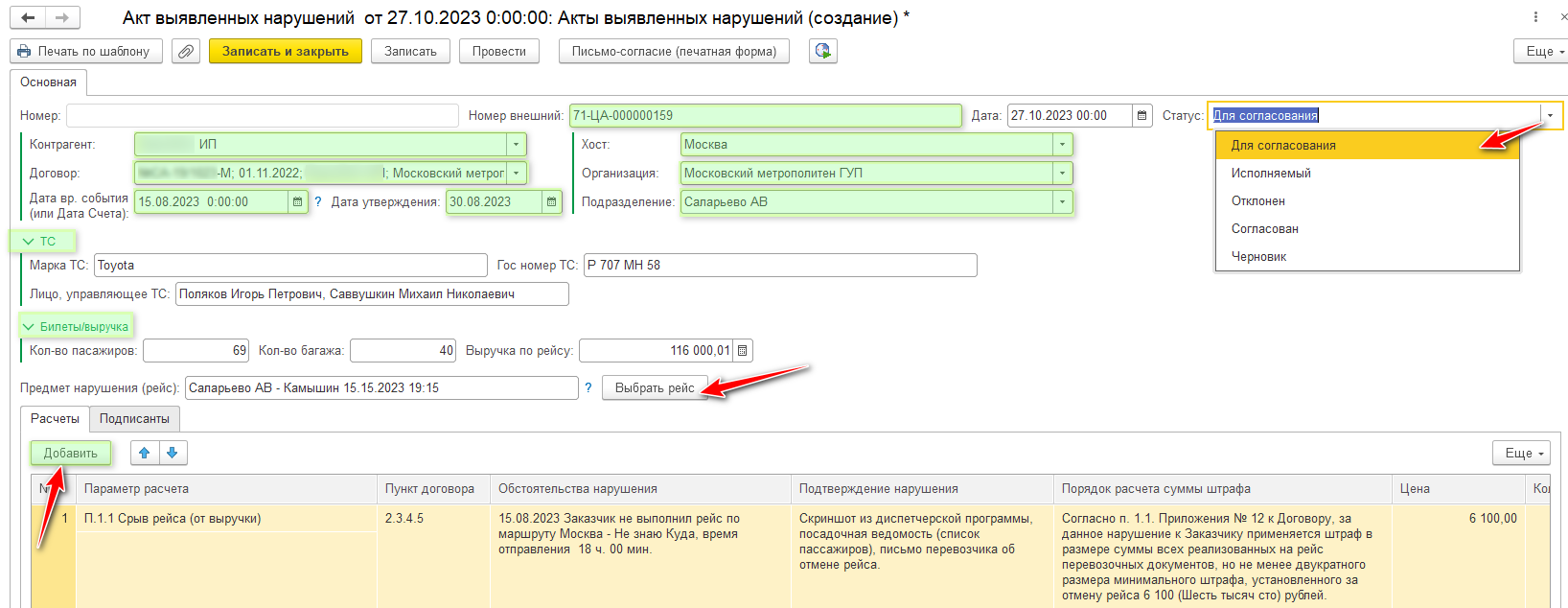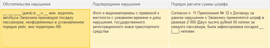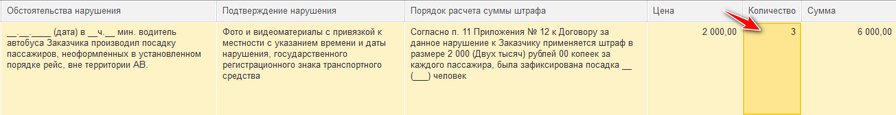 Каждый из этих пунктов ссылается на свой пункт в договоре, имеет определенную формулировку для Обстоятельства нарушения, Предмета нарушения и Порядка расчета суммы штрафа. Так же уже установлен тариф для данного вида нарушения. В некоторых случаях тариф должен увеличиваться кратно количеству нарушений. А значит в строке количество нужно будет поставить нужную цифру.