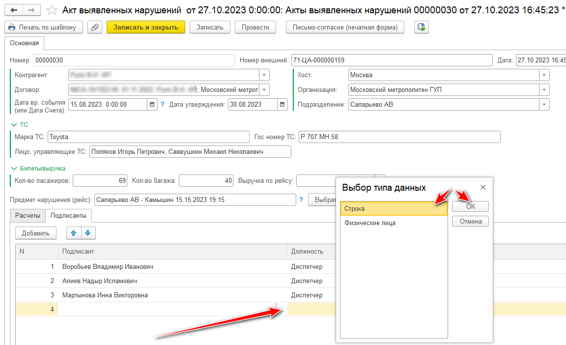 После внесения сведений нажмите кнопку Записать. Переключитесь на вкладку Подписанты, чтобы указать группу лиц, ответственных за фиксацию нарушения.