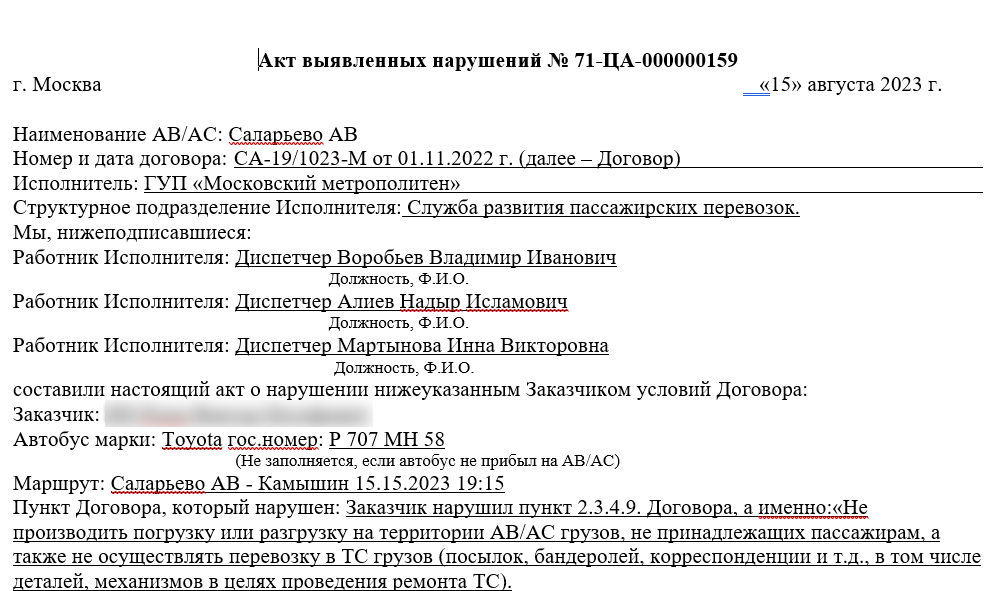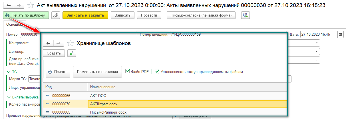 Проведите документ. Из этой же формы вы можете распечатать Акт о нарушении и Рапорт о нарушении для перевозчика.