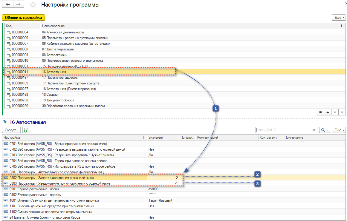 2. В настройке 0802 Пассажиры - Запрет оформления с оценкой ниже - устанавливаем оценку ниже которой будет запрещено оформление билета пассажиру.
