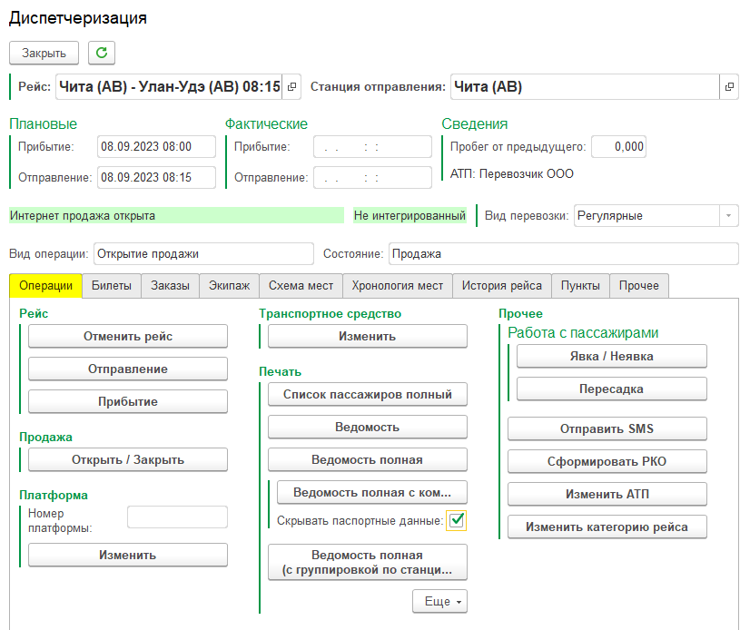 Чтобы начать работу с рейсом дважды щелкните ЛКМ по его наименованию. Откроется окно Диспетчеризация.