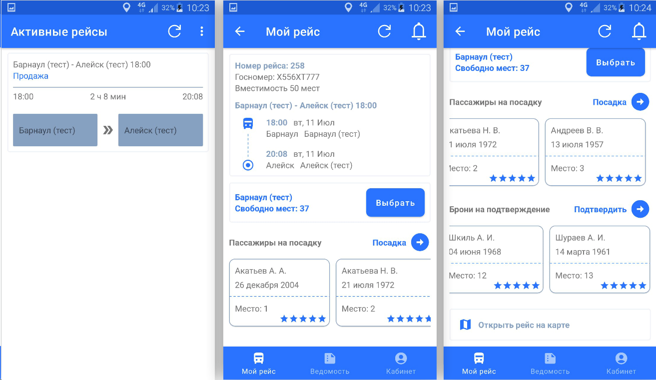 этапы прохождения по всем пунктам рейса. На рабочей панели внизу имеются кнопки Мой рейс, Ведомость, Кабинет.