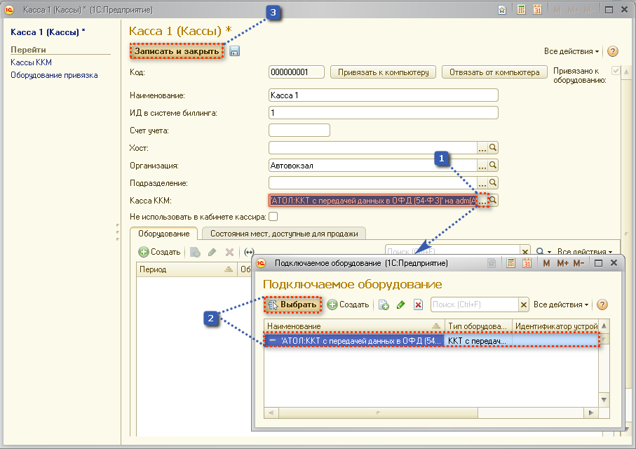 2) Выбираем ту кассу, к которой хотим подключить кассовое оборудование.