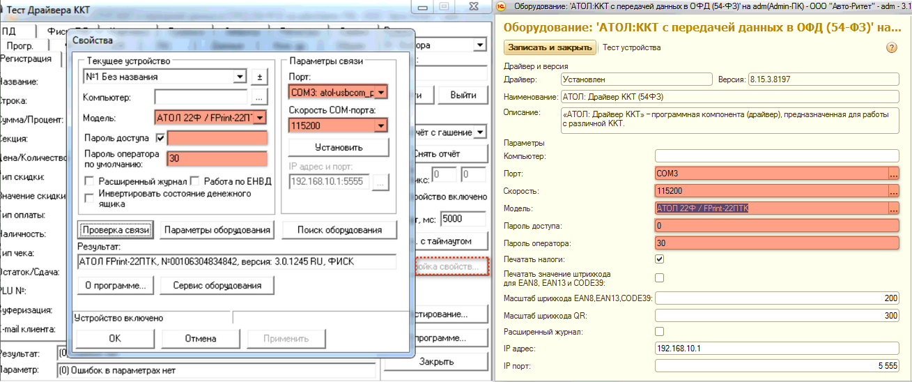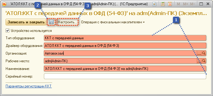 2) Вводим настройки кассового оборудования (настройки кассового оборудования берём из уставновленного на компьютер драйвера).