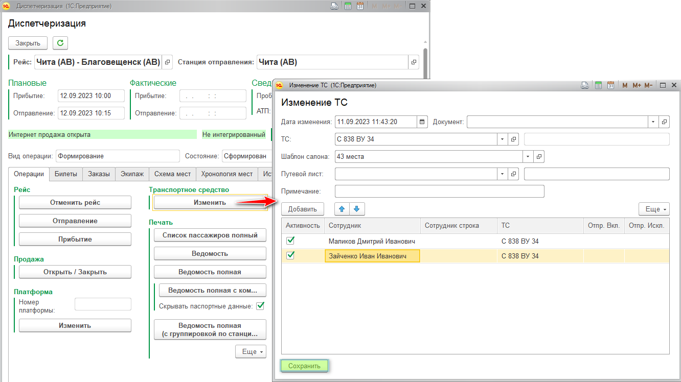 Обычно ТС и экипаж назначается при создании рейс-расписания, сильно задолго до реального отправления рейса. Поскольку эти данные могут быть уже неточными, то нажмите кнопку Изменить и укажите верное ТС и водителей. Важно помнить, что вы не можете ставить в поездку ТС с меньшим количеством сидячих мест, чем у вас уже продано билетов.