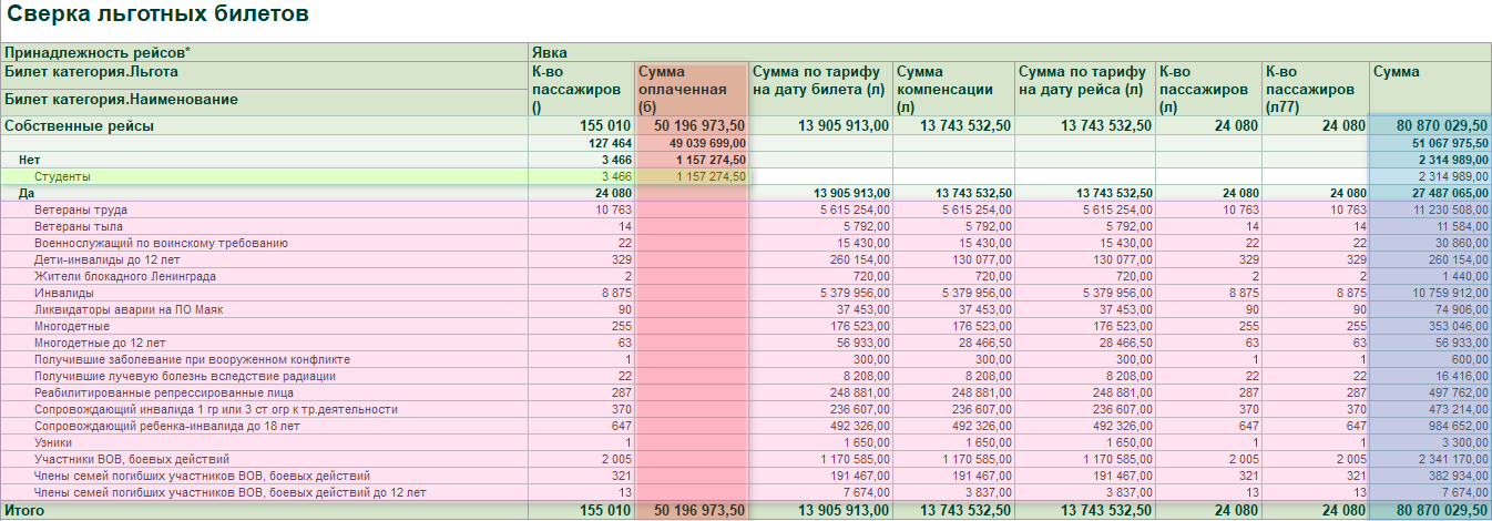В данном отчете мы можем посмотреть сумму по льготному тарифу на момент продажи билета,