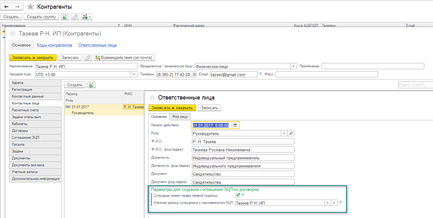 В карточке контрагента в разделе Контактные лица должна содержаться информация о человеке, который имеет сертификат ЭЦП и имеющим право подписи.