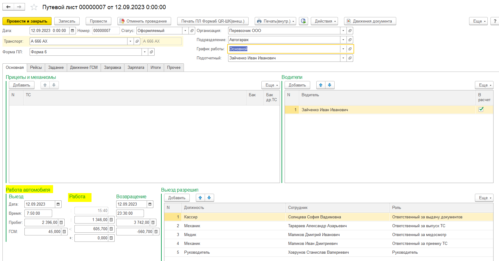 Меню Пассажирские перевозки - Документы - Путевой лист