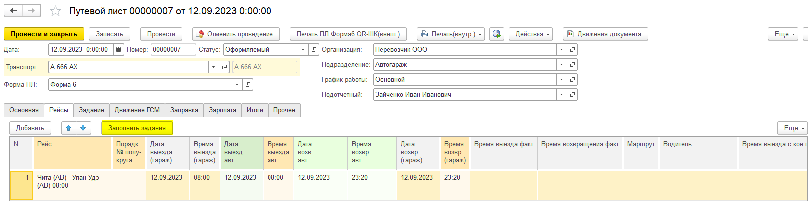 На вкладке Рейсы нажмите кнопку Заполнить задание.