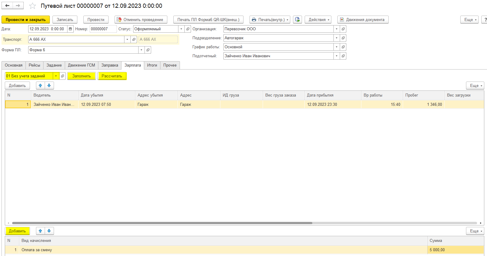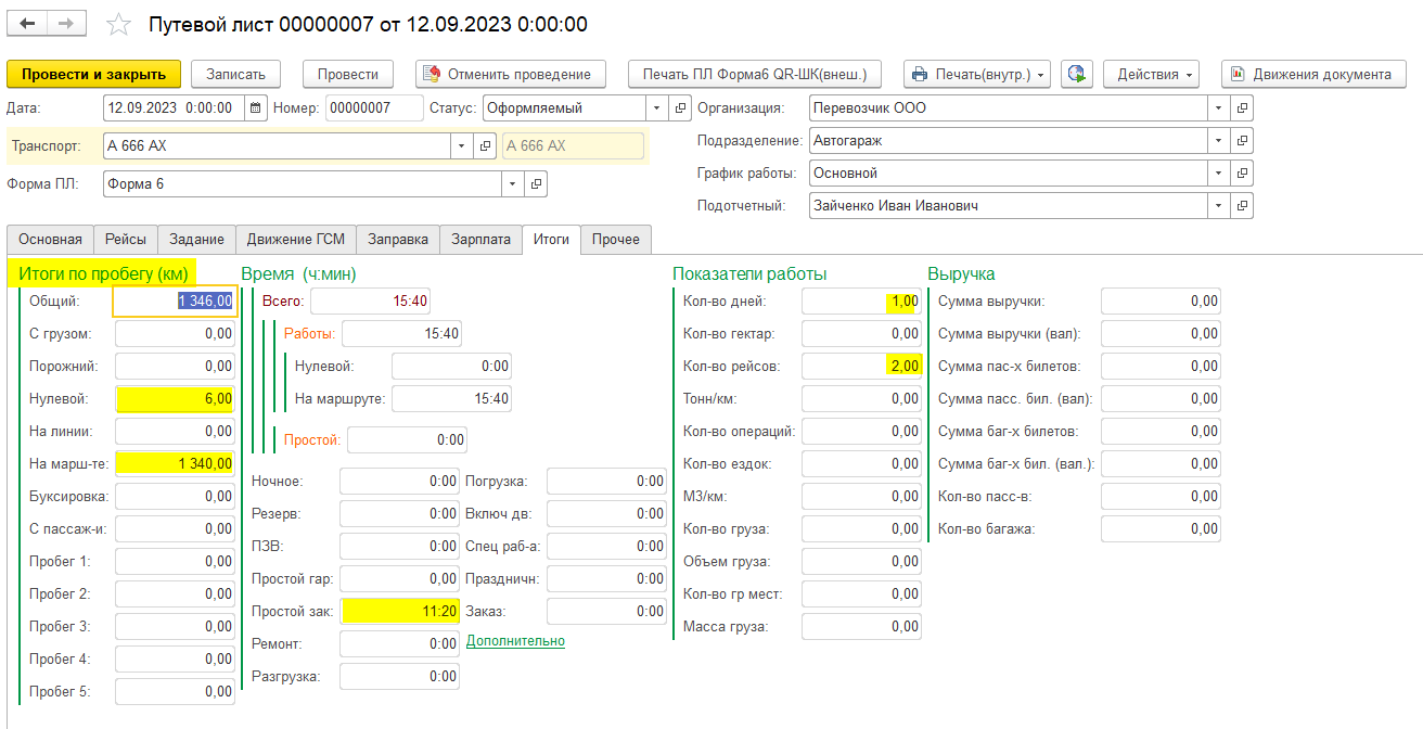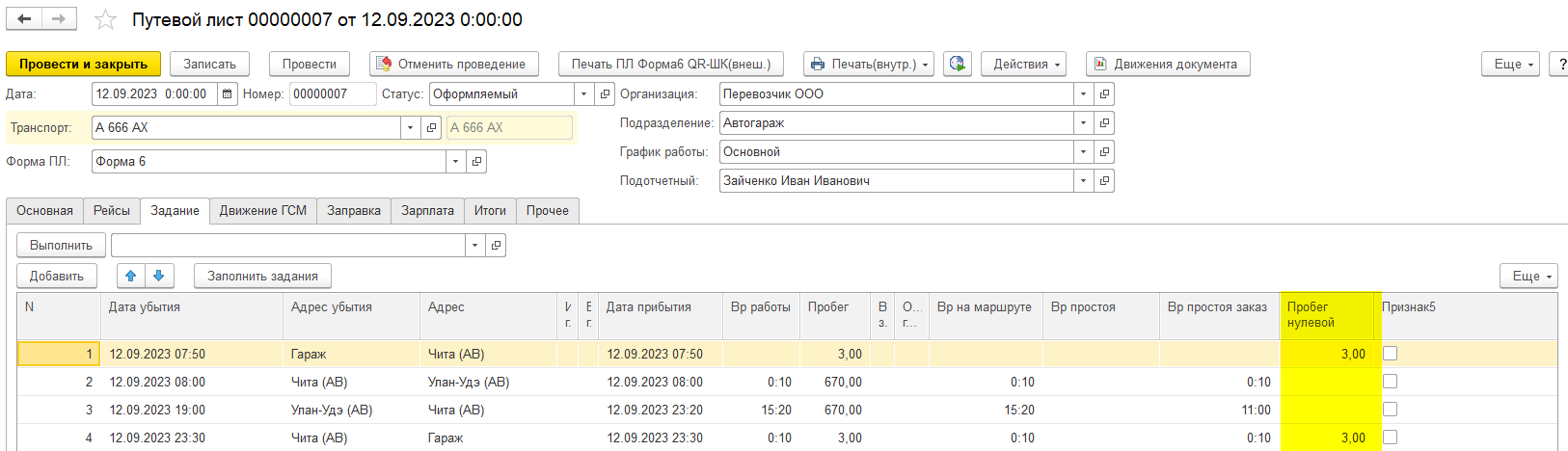 На вкладке Задание вы видите часы работы экипажа, пробег по рейсу, в том силе нулевой пробег - пробег от гаража до места первого пункта посадки.