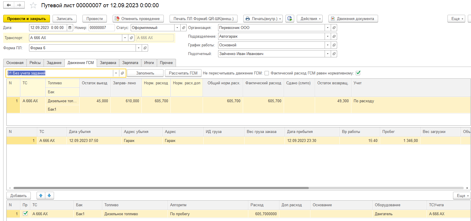 Вкладка Движение ГСМ частично заполнена, нажмите кнопку рассчитать ГСМ. До тех пор, пока не заполните следующую вкладку Заправка, там будет отрицательный баланс.