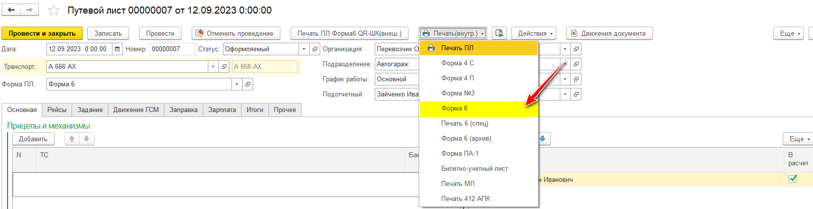 Чтобы распечатать ПЛ, нажмите кнопку Печать - Форма 6