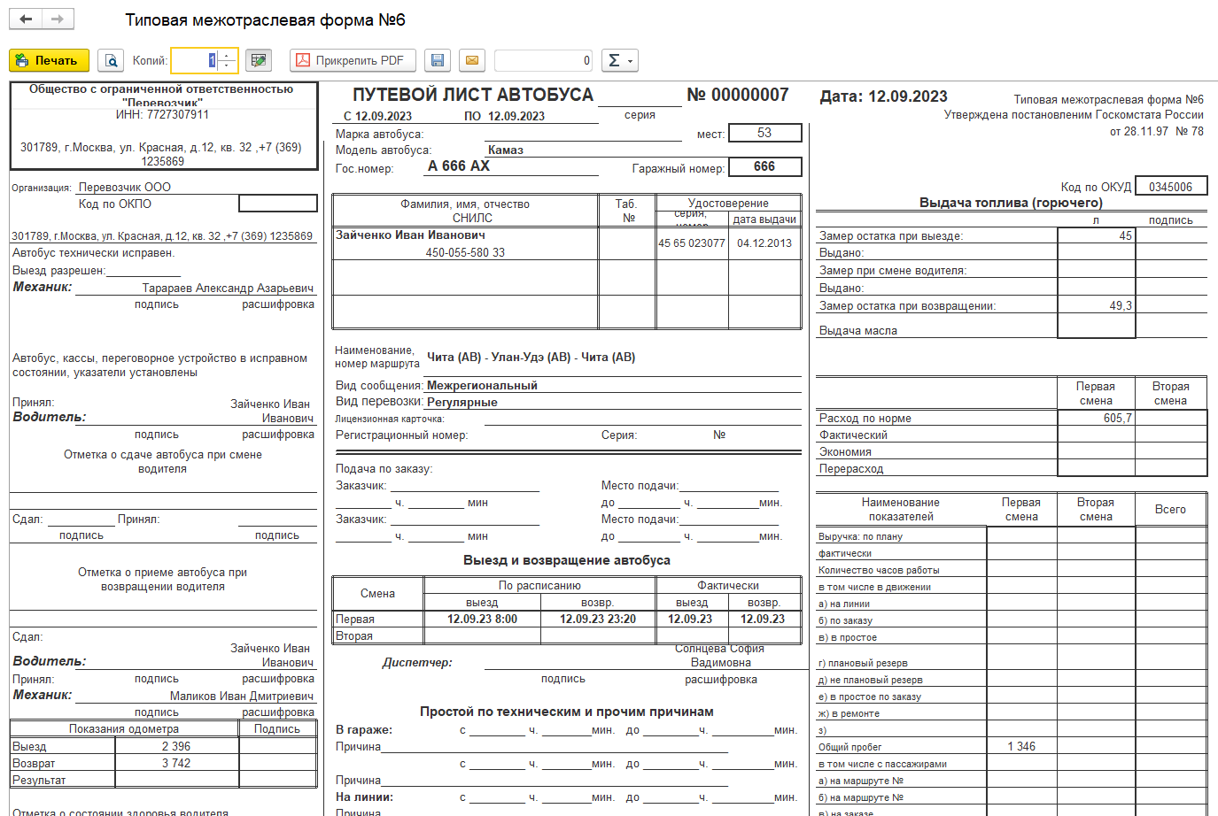 Путевой лист сформирован автоматически на основе ранее внесенных данных.