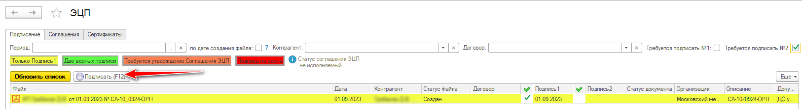 Документы, подлежащие подписанию светятся желтым цветом. Те, что успешно подписаны с двух сторон и имеют активное соглашение, светятся зеленым цветом. Чтобы видеть только документы, которые нужно подписать, установите галочку Требуется подписать №2.