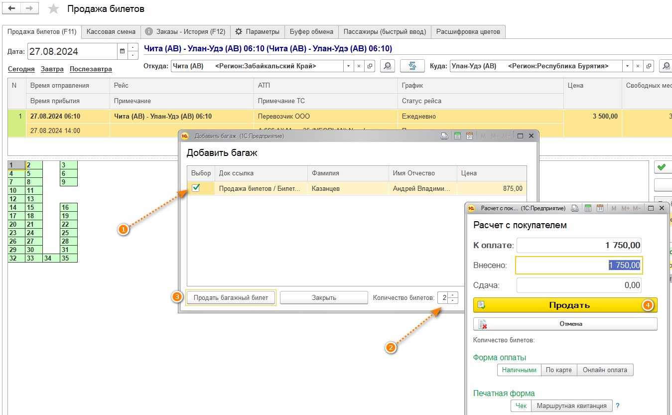 Если все верно, то нажмите кнопку "Продать" и произойдет фискализация чека. Если необходимость в оформлении багажа отсутствует - нажмите кнопку "Отмена".