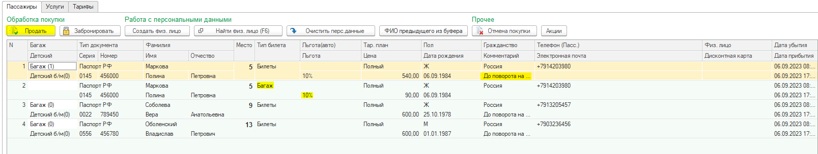 Проверьте сведения, проставьте багажные билеты или скидки, если нужно, то напишите комментарий и нажмите кнопку Продать.