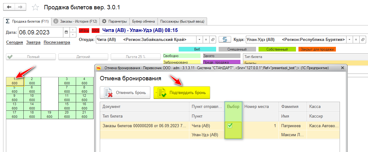Зайдите в форму продажи на нужный день. Двойным щелчком нажмите на забронированное место.