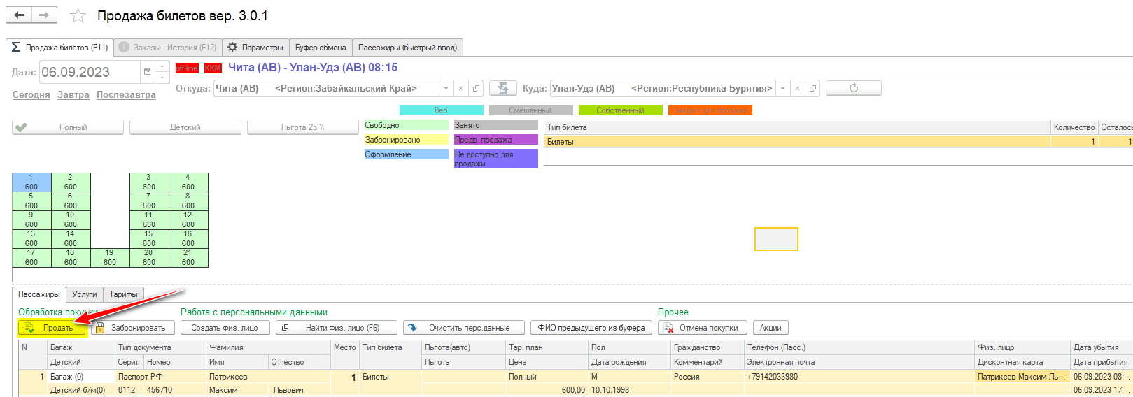 Автоматически откроется форма продажи билета, проверьте все данные о пассажире, нажмите Продать.