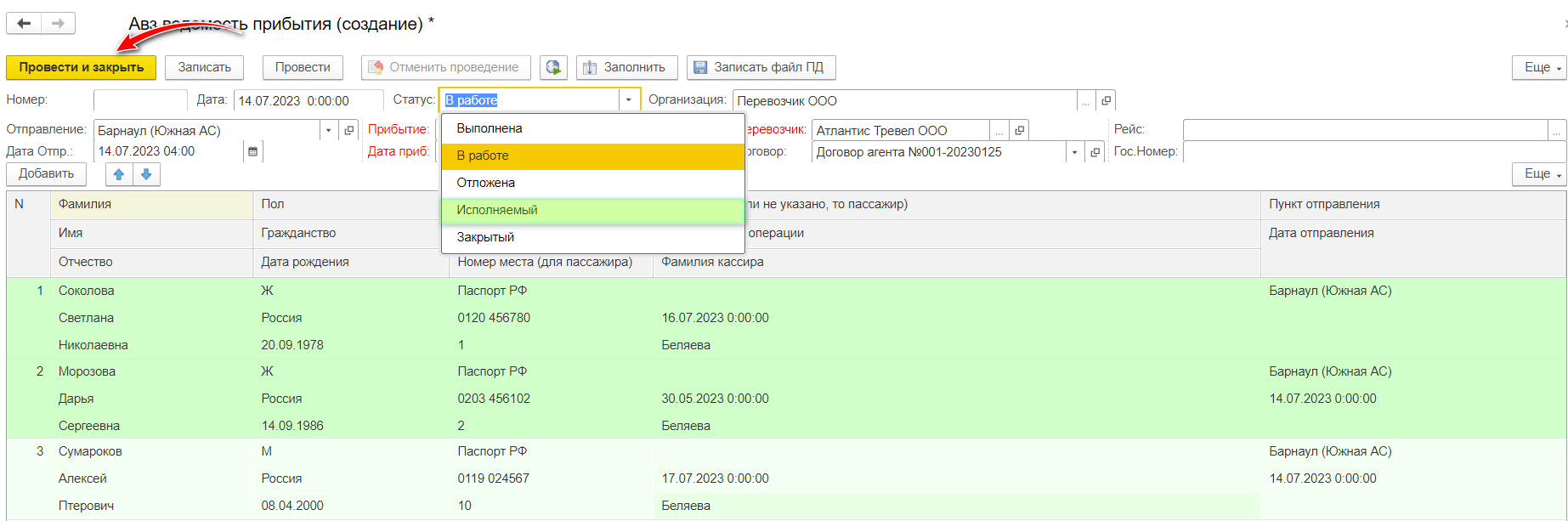 После того, как поменяли статус, документ автоматически записывается, просто закрываем документ.