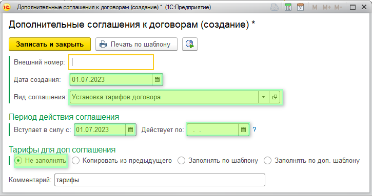 Заполните сведения о тарифах, нажмите Записать и закрыть.