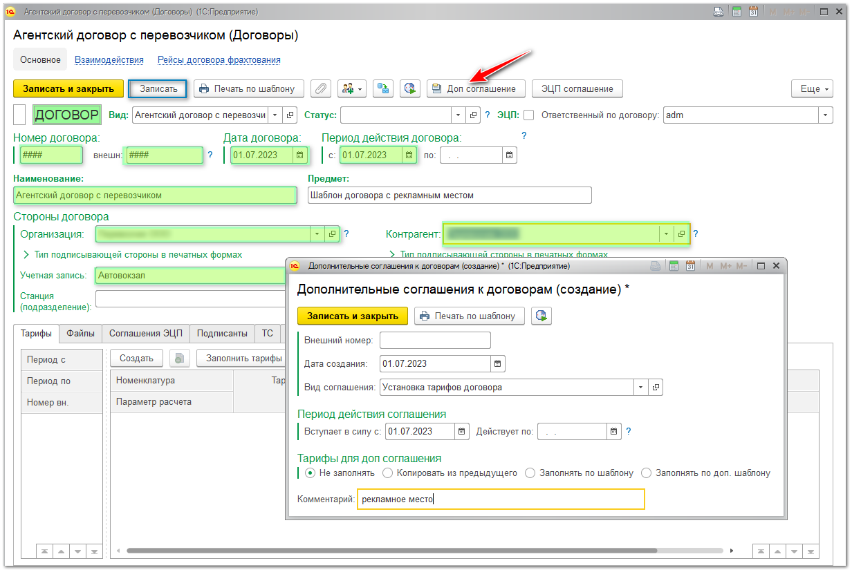 После заполнения реквизитов нажмите кнопку Записать и нажмите кнопку Доп. Соглашение.