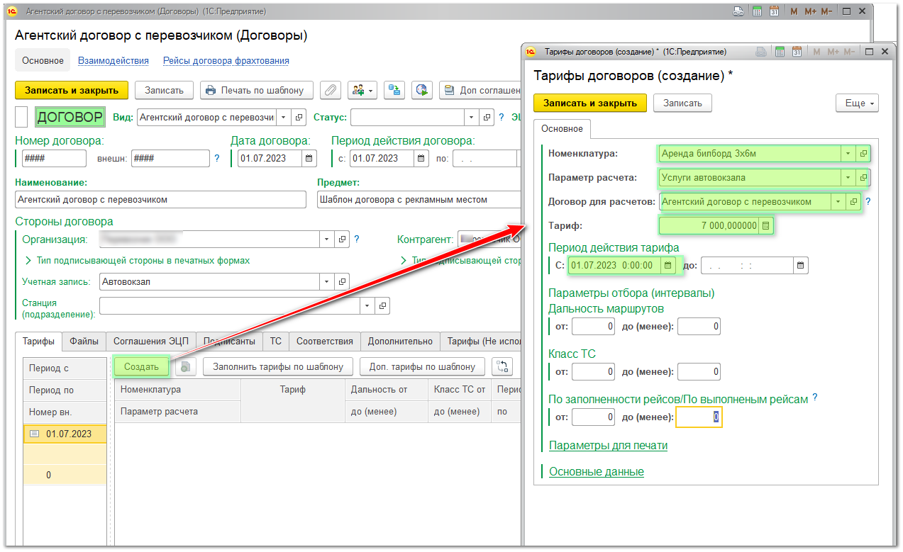 Заполните реквизиты, нажмите Записать и закрыть. В табличной части вкладки тарифы нажмите кнопку Создать.