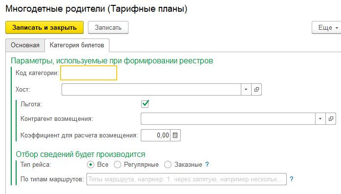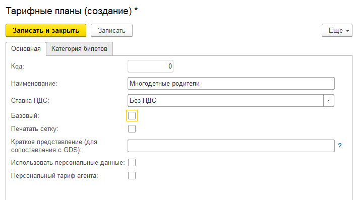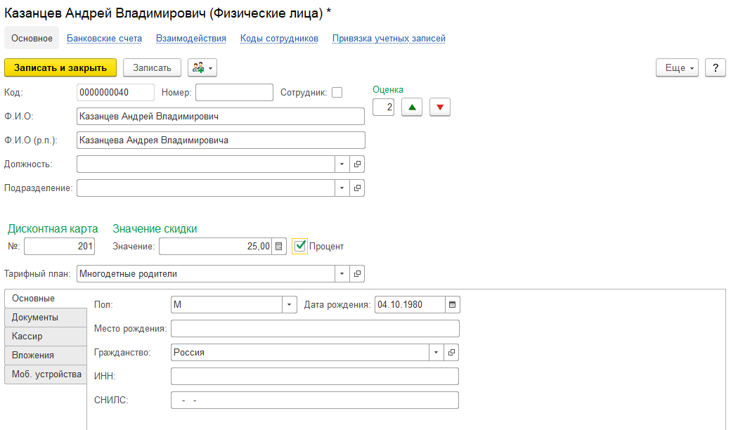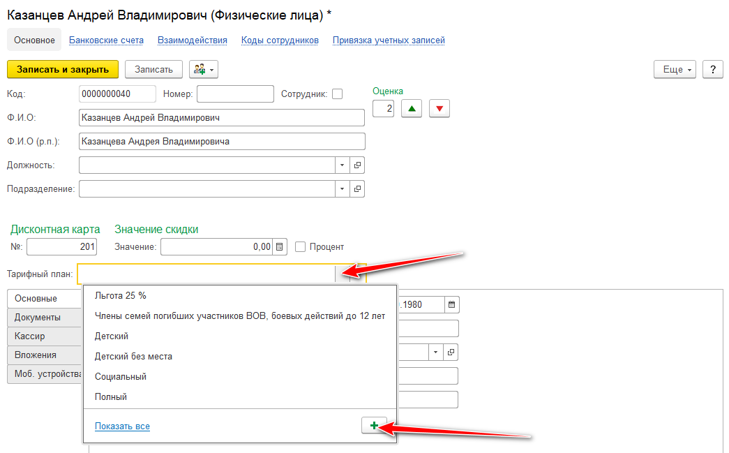 Для граждан у которых уже имеется карточка физ.лица в программе, можно установить программы лояльности. Создайте свой тарифный план, укажите наименование и поставьте отметку, что это льгота. Скидка может быть как в фиксированной сумме (значение), так и в процентном соотношении к базовому тарифу. Для расчета в проценте надо поставить отметку Процент.
