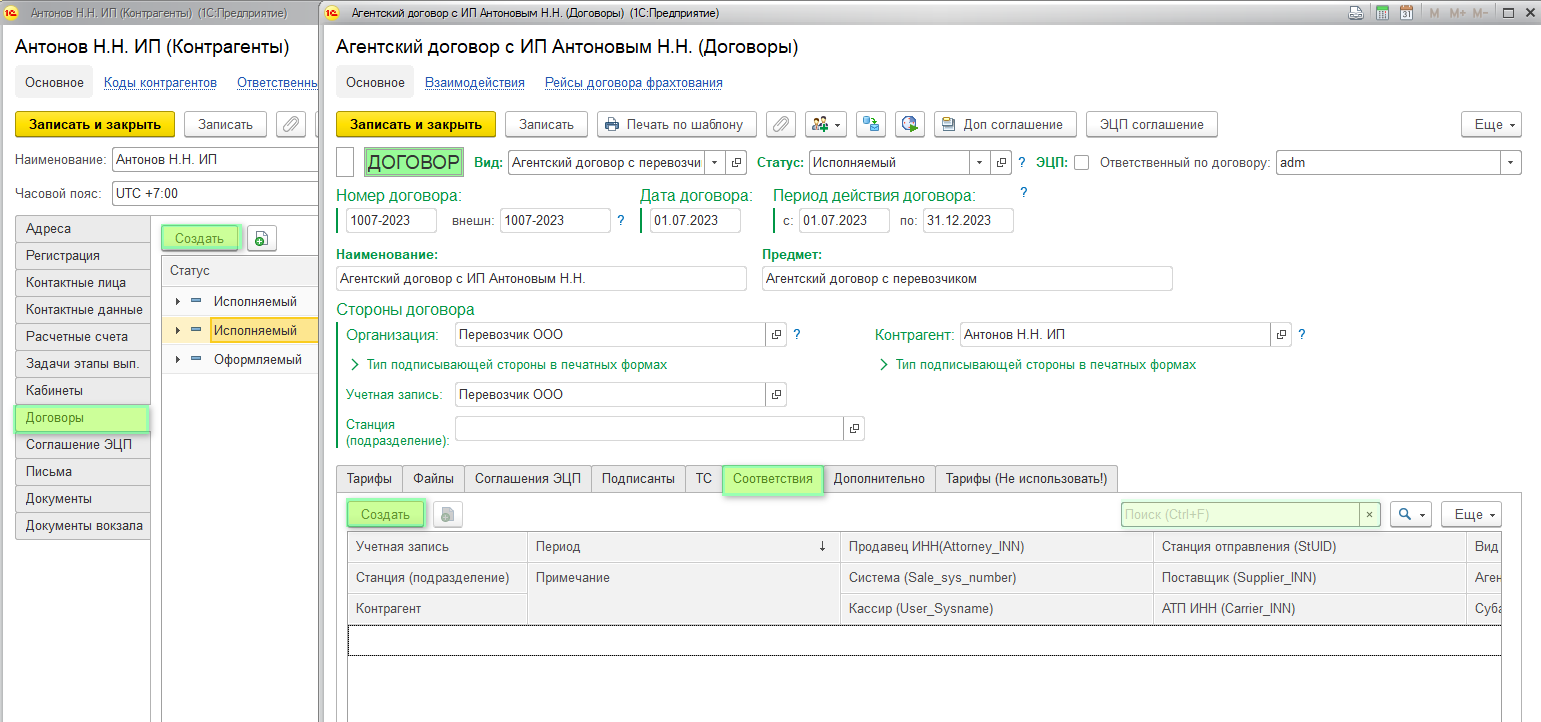 Откройте карточку Контрагента, выберите нужный исполняемый договор, на вкладке Соответствия нажмите кнопку Создать.