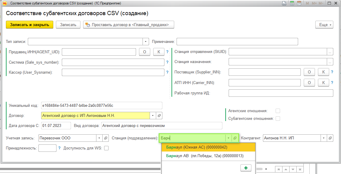 Большая часть реквизитов заполнится автоматически, необходимо лишь выбрать Станцию (подразделение). Нажмите Записать и закрыть.