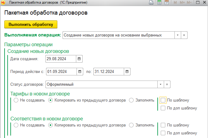 В диалоговом окне выберите операцию "Создание новых договоров на основании выбранных".
