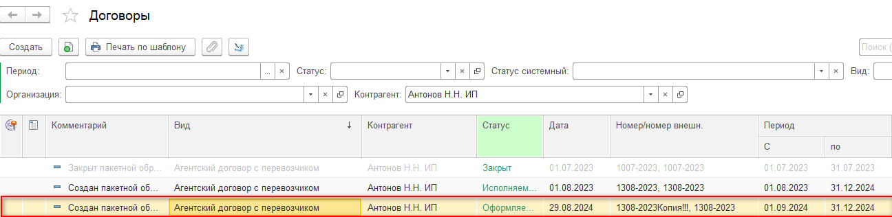 Диалоговое окно закроется и в списке договоров появится новая запись. Если обратить внимание на номер, то он совпадает с документом-основанием и имеет приписку Копия!!!!