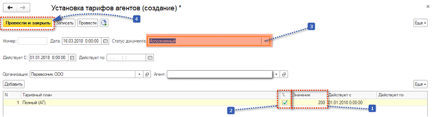 Выбрали нужный «Тарифный план». Установите стоимость для агента. Нажимаем провести и закрыть.