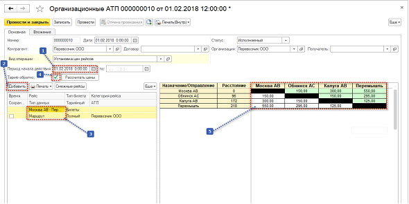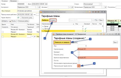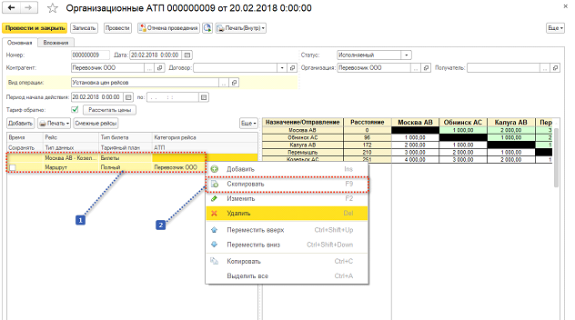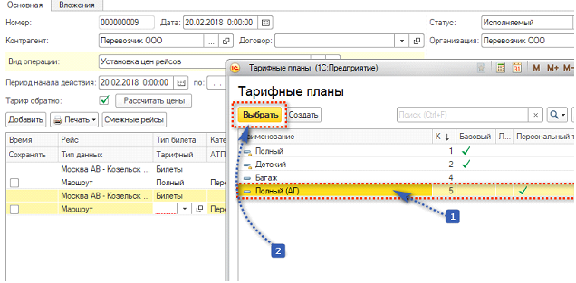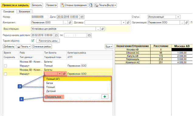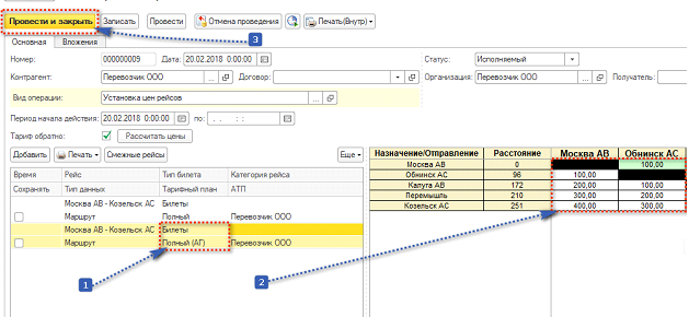В окне справа заполняем цены по тарифу на прямой и обратный путь.