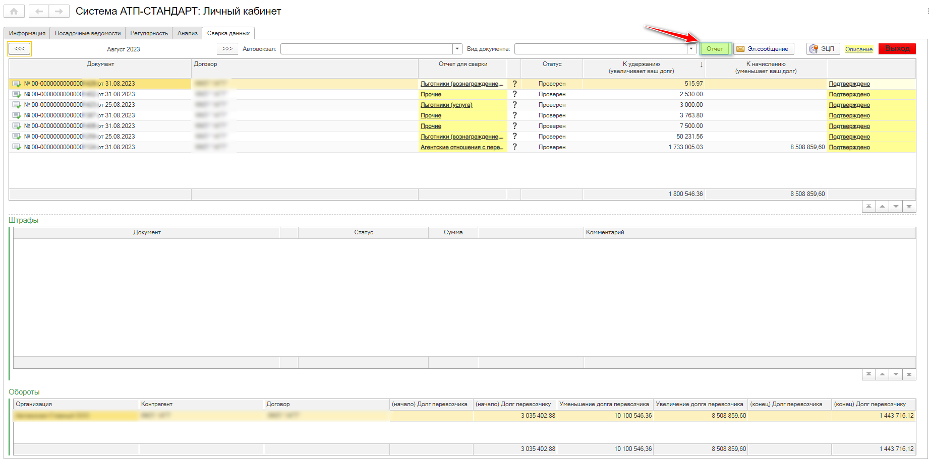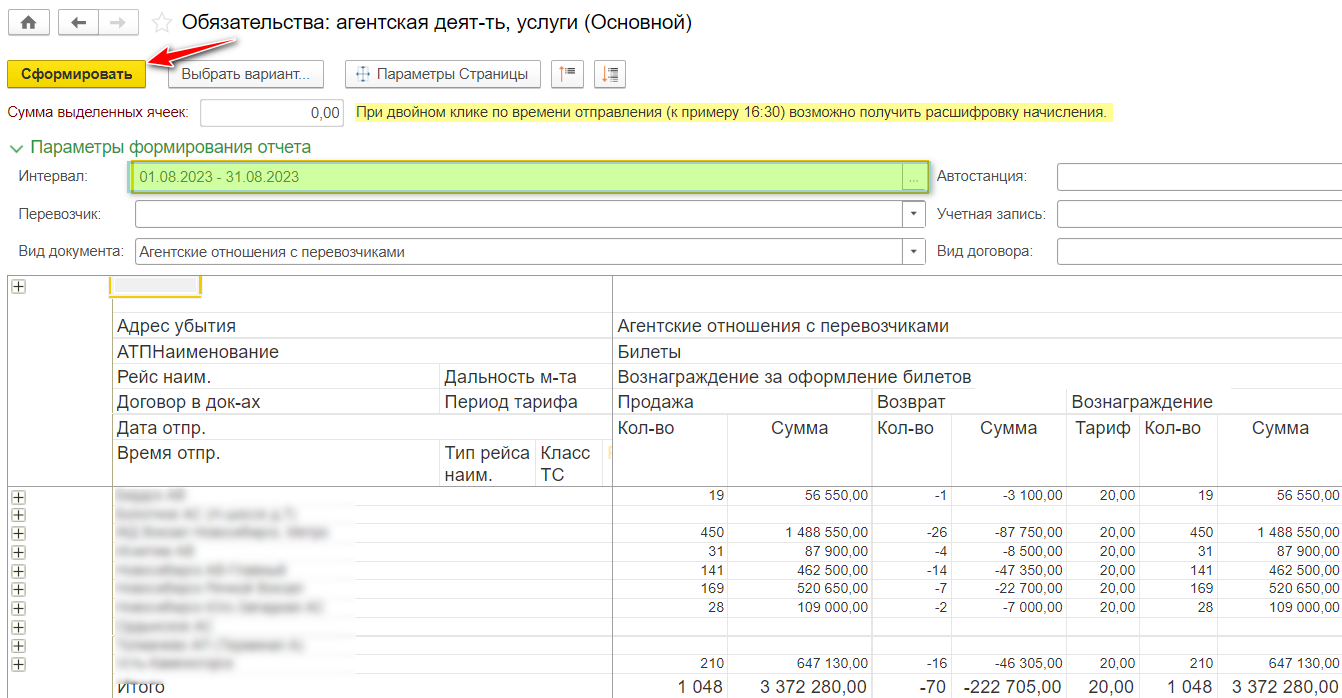 В подвале табличной части раздел Обороты показывает суммы взаиморасчетов между Перевозчиком и Вокзалом.