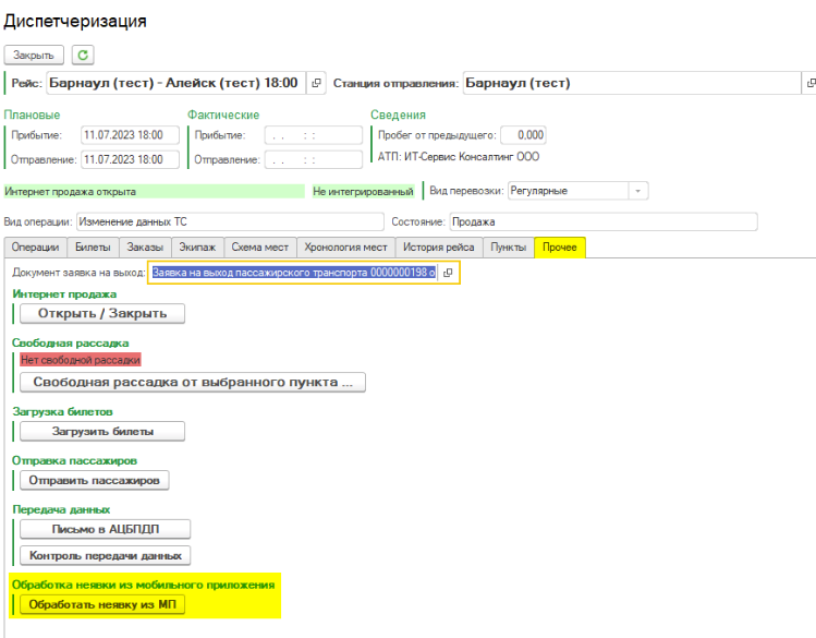 меню Автостанция - Диспетчеризация. Нажмите кнопку Обработать неявку из МП.