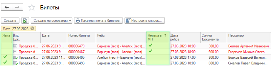 В списке билетов то, что обработано как неявка из мобильного приложения, помечается галочкой.