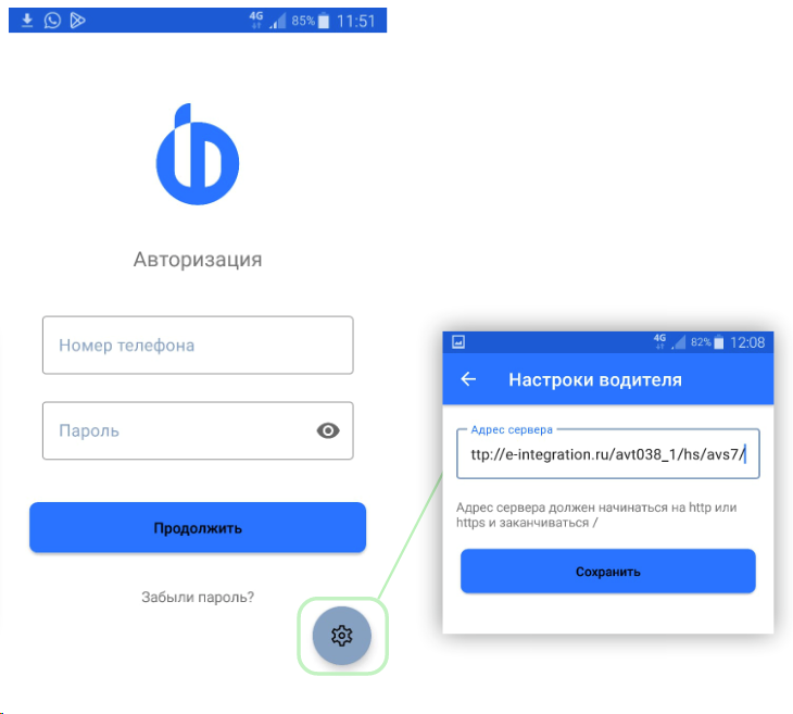 Запустите приложение. Каждая база перевозчика имеет свой путь подключения, необходимо вписать его в настройки приложения. Нажмите на иконку настройки, вставьте туда ссылку, полученную от разработчиков. Нажмите кнопку Сохранить.