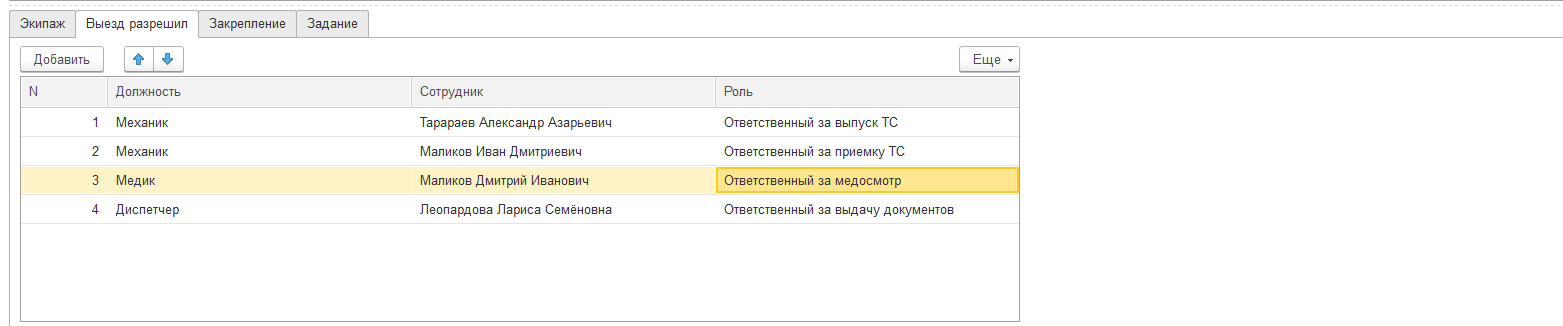 В нижней части заполните Экипаж и Сведения о лицах, разрешивших выезд: медик, два механика, диспетчер.