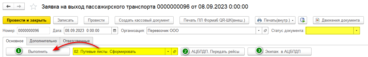 Чтобы сформировать путевые листы В разделе "Основное" из выпадающего меню выберите Путевые листы. Сформировать. и нажмите кнопку Выполнить.